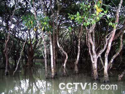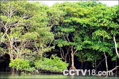 世界上的红树林大致分布在南、北回归线之间的范围内,共有两个分布中心,一个在东亚,一个在中南美洲,而以东亚的较为繁茂。我国的红树林与东亚的红树林是同一类型,主要分布于广西、广东、海南、台湾、福建和浙江南部沿岸。在太平洋西岸,无论是种类和分布范围,我国的红树林都具有代表性,由南部的海南到北部的浙江,随纬度的提高,红树植物种类明显减少。海南是我国红树植物种类最多,红树林生长最好的地方,浙江是我国红树林分布最北的省份,其他几个省区的红树植物种类数相近。秋茄、白骨壤、桐花树、老鼠勒和卤蕨是我国分布较广的常见红树植物种类。 东寨港据史料记载,1605年7月13日午夜(即明万历三十三年),琼州“大地震”,琼北东部海岸大面积下沉,一时间72个村庄沉降,形成今日的东寨港湾。清代光绪年间,曾立有“禁砍滩涂木”碑,对红树林给予保护。东寨港红树林自然保护区于1980年1月建立,是我国建立的第一个红树林自然保护区,1986年7月经国务院批准晋升为国家级自然保护区,1992年被列入国际重要湿地名录。 东寨港有“一港四河、四河满绿”之说。其东有演州河,南有三江河(又称罗雅河),西有演丰东河、西河,四条河流汇入东寨港后流入大海。这些河流每年有7亿立方米的量注入东寨港。暴雨季节,河水挟带大量泥沙,在港内沉积,形成广阔的滩涂沼泽。红树种子凭借“胎生”的独特繁殖方式,随波逐流地在水上漂泊,一遇到海滩就扎根生长发育,蔚然成林。
