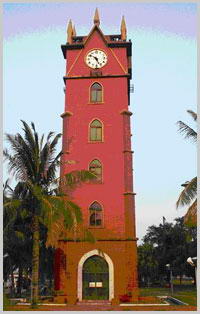 海口钟楼屹立于海口市区北部,红色的楼体与周围的绿地极为和谐,景致幽雅,风姿绰约,已经成为海口的最重要的标志性与象征性建筑物之一。 海口钟楼历史悠久,康熙二十四年(公元1686年)海口设立统管本岛沿海十处的海关总口,国内沿海港口和东南亚各国来往商船日渐增多。咸丰八年(1858年),海口被清廷辟为对外口岸,来往客商明显增多。国民12年(1923年),海口海运发达,港口繁荣,商务活动鼎盛。但当时海口全部还没有一个统一标准的计时设施,给交通、商务和人民生活带来很大的不便。民国17年(1928年)爱国商人周成梅先生发动海外侨胞捐款集资仿照广州、上海等沿海城市,于1929年在遥对入海口的长堤马路码头,兴建钟楼以便统一全市时间。 海口钟楼属混合结构,高五层,占地16平方米,墙体用红砖砌筑,白石灰勾缝。
