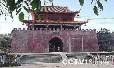 被修复后的南城门呈圆拱形,为赭红色,门庭垛口仿旧式修复,门上“文明门”三字是清代碑刻,字迹清晰如故。修复后的南门上添建一座两层亭式楼房--文明楼,与城门浑然一体,使之更加雄伟壮观。南门左右各修建一段长约50米的城墙,只是象征性的,已非旧时规模。登上城门,可以眺望10里之外的山白云,俯视宁远河畔的水南绿竹。 |