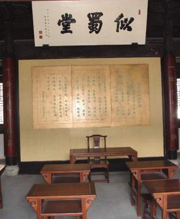 东坡书院的第二进,是长方形的“载酒堂”。这里曾是苏东坡讲学、会友的地方,是东坡书院的主体建筑。堂中两侧,有历代名人的诗文碑刻13座。后墙上的两幅大理石刻,右边一幅为明代大文学家宋濂所题,左边一幅是明代大画家唐寅所画的《坡仙笠屐图》:苏东坡头戴竹帽,脚穿木屐,高卷裤管,身体向前倾斜,在村路上顶雨急归。 东坡书院的最后一进是大殿,大殿正中有一组玻璃钢制作的塑像,是苏东坡和儿子苏过以及好友黎子云,殿上题匾为“鸣雪因缘”。大殿里还陈列着苏东坡的许多书稿墨迹以及他在海南的文物史料。在东坡书院两侧各有一座小跨院,分别叫作东园、西园。西园是座花圃,在花海中蠢立着苏东坡铜像,他手握书卷,脚踏芒鞋,儒雅风流。东园里有一口井,叫钦帅泉,为明万历年间所挖,井水清凉甘冽。 东坡书院中还设有展览馆、望京阁等供来海南旅游的旅客参观、游览。 |