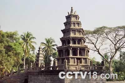 双塔相距20米,分别坐落在立于池水中带石柱围栏的塔基上,每一塔基前设有月台,均有弧形引桥式石阶梯连接池外。四周簇簇翠竹,溪涧泉水积潴,怡静幽幽园圃,犹入一方净土。据说,姐姐后来还俗嫁人,故塔身供养的都是文武官员雕像;而妹妹一生与佛相伴,故其塔身雕像全是佛教人物雕像。 美榔双塔整体造型协调美观,淳古朴拙,最杰出的是其精湛的石雕艺术,石工精致,风姿绰约。数十尊浮雕刻工精巧细致,雕像裙带飘摇,形象栩栩如生,反映了宋末元初的社会世俗生活,堪称琼州石塔中杰出的艺术珍品。尤其是双塔通体的建筑材料系采用琼北火山地区的玄武岩,建筑工艺系采用榫眼凹凸相接,条石干摆叠码不粘合的独特方式,堪称一绝。经过800多年风风雨雨的侵蚀,虽然存在不同程度的风化损害,主体建筑却没有倒塌毁坏,实属国内罕见。 美榔双塔旁的大榕树下,竖立着一圆首龟趺状的玄武岩石碑,原有近千字的阴刻碑文,由于800年岁月的无情风化,已无从辨认碑文的内容,成为名副其实的无字碑,从而悄无声息的为今人留下丝丝悬念。明朝进士唐绢曾生发怀古慨叹,赋诗赞颂:“西竺原为舍利天,移来琼岛亦巍然。依稀两汉争雄日,仿佛双乔并立年。”更为浪漫感人的美郎双塔蒙上一层朦胧玅曼的面纱。 美丽的传说与石塔的风格艺术,折射出海南人民的千古真情。美榔双塔不愧为中华古塔中的珍品。1996年被国务院公布为“全国第四批重点文物保护单位”。它不仅为研究海南古代文明发展史和建筑艺术提供直接依据,而且也具有较大的旅游观赏价值。 注释: 【1】缗,为货币和计税单位。即成贯的钱,一千文为一缗。起源于汉武帝时期的“算缗”。由于连年征战,西汉王朝国库空虚,聚集大量财富的富商大贾却不肯捐资以解国家之急。公元前119年特颁布“算缗令”,开始对商人、高利贷者和手工业者征车船税和财产税。公元前110年,算缗政策停止执行。 |