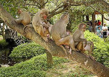 每群猴子都有两个猴王—— 大王和二王(或叫副王)。只有战胜(本群落中)所有公猴的猴子才可获得大王的地位。大王不在,副王才能指挥猴群。猴子总是在树上栖息,不步穴居,风雨天气也一样,因为蟒蛇是猴子们的宿敌。 多年来,有关部门对这里的猴群采取了一系列保护措施。目前,已经基本对部分猴子驯化成功。只要听到哨子响,它们便呼啦地奔下山来,在距人咫尺地方争食、追逐,有的甚至向客人招手或上前索取食物,但它们很少糟塌庄稼和伤害牲畜。猴群无愁无忧地生活在这个人为监护管理的大自然生物圈里。 南湾猴岛真正成了猴子的乐园。游客只要从陵水县县城沿海榆东线公路驱南行14公里,到达新村渔港,乘吊索渡过只有500米宽的浅海湾,步过海滩,进入茂密的热带丛林,就会看到这个得天独厚的“花果山”,看到孙大圣的子孙后代们逍遥自在的极乐世界了。 |