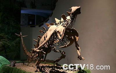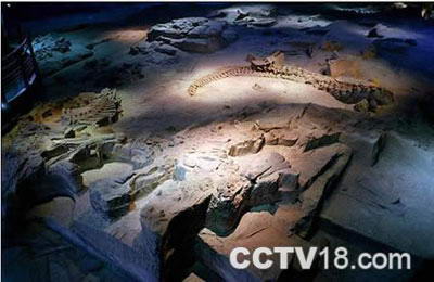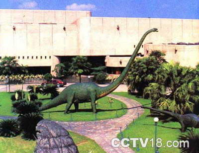 恐龙博物馆的外型,很象一座巨大的岩窟,造型奇特美观,是我国继西安半坡博物馆、秦始皇兵马俑馆之后修建的又一大型专业性现场博物馆。它占地2.5万平方米,陈列面积3600平方米,分为三层。陈列以大山铺恐龙化石埋藏现场及出土的恐龙化石为主。展览共分三个部分: 第一部分 着重介绍与恐龙相关的基础知识、如生物进化、化石、地质年代、恐龙的演化与分类等等。 第二部分 主要介绍大山铺的各类恐龙化石。它们陈列在高大宽敞的装架厅里,这里有几副完整的恐龙化石骨架,其中“天府峨嵋龙”是该厅最引人注目的庞然大物。它的头被细长的颈支的老高,离地面约10米,全身长约20米,躯体粗大,尾巴很长,四脚着地,昂首挺立。大厅里除了“天府峨嵋龙”之外,还是一具凶猛的能食“天府峨嵋龙”的“建设气龙”的骨架,但它全身长仅四五米。其他还有进步性与原始性相兼地蜥脚类恐龙-李氏蜀龙,身躯细小,两足行走的鸟脚类恐龙-多齿盐都龙,早期的比较原始的剑龙-太白华阳龙,空中飞翔的龙和遨游水中的凶猛肉食性蛇颈龙等等。 第三部分 是恐龙埋葬遗址。这里向人们展现了大面积的发掘现场。左图就是“天府峨嵋龙”[点击放大]看看博物馆对它的介绍1979年在自贡大仙铺发现恐龙群窟,经过整理,共有200多个恐龙个体,其中较完整的骨架18具,如此众多的恐龙共处一窟,顿时引起世界的关注,之后又陆续发掘出大批珍贵的恐龙化石,成为一个罕见的恐龙化石宝库。至今自贡已有70余处发掘出恐龙化石。