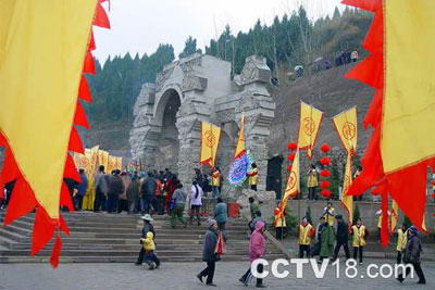 碑亭前的香炉也是目前全国别具特色的石制龙凤浮雕香炉,长7m,宽1.5m,高2.5m。 陵(墓)区墓台为半圆形,左右两边各设圆形化钱炉一个,正中为排楼。排楼前面是直通嫘祖湖起点平台的神道。神道全长400m,宽20m。设下平台、中平台和上平台。平台与平台之间分12组阶梯相通,象征每年12个月。各组阶梯依据农历每月天数设计梯步数,按“地支”顺利排列,并在每组梯步中雕刻十二生肖图案。神道两侧是56根图腾柱,象征中华56个民族。中平台设计为正方形九宫大祭坛,边长90m,分9块正方形小平台,每个小平台边长30m,高低错落,寓意九宫八卦。大平台正面设20m高嫘祖像浮雕墙,东南西北设4道石刻门,寓意春夏秋冬。大平台主要用于大型祭祀活动,可容数千人。 嫘祖陵(墓)左右两侧山嘴将各建钟亭鼓亭一个,晨钟暮鼓,山谷传声,使人肃然起敬。 |