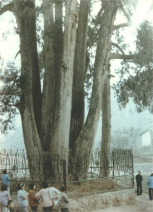 安昌镇西北的大安山麓,西山之侧,九顶山下,有几株千年古柏,是安县的八景之一。这里就是有名的“七贤柏”。 相传很久以前,那里是一片荒地,只有座孤零零的古庙,庙里住了个老和尚和七个小和尚,师徒们自耕自食,过着俭朴的生活,据说老和尚是遭了水灾,从河南逃荒到这里的。当时听到这里三岁小孩都能唱:“圣灯一盏照安州,腊溪桥前水倒流,犀牛望月回头转,浮山挡住铁牛头。” 他认为歌谣很有意思,就决定不走了,选中现在的“七贤柏”处,就在古庙里住了下来。 老和尚让小和尚在庙前后栽上些树苗,在只剩几棵柏树苗时,雷声大作,风雨交加。小和尚慌忙栽下七棵,而把剩下的的几棵树苗栽在一起,准备雨后分栽。雨是数日不停,等雨过后,那柏树竟然已发出新枝来,长得十分翠绿,再也分不开了,就成了八棵柏树中最大的一棵。 几十年后,李白来到此地,叹其奇妙,惊呼“七贤挺秀”,还乘兴写下了“七贤柏”三个大字。 至今,庙虽毁,树尚在。 |