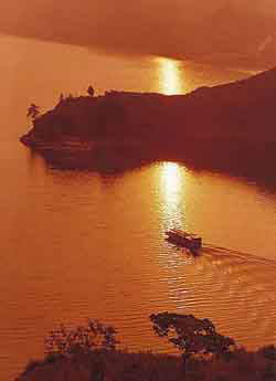 在这乾坤为匠,造化施工的平畴沃野、雄峡幽谷间,白龙湖尽情舒展她那娇美动人的身姿,集雄、奇、险、幽、秀众美于身,似卷帙浩繁的山水画卷,置身其中,使人留连忘返。 白龙湖烟波浩淼,壮阔奇丽。在雄阔大山和莽苍林海的陪衬下,万顷碧波弹奏着气势宏大的旋律。旭日东升,湖面上闪动万点金鳞,湖光反照,把环绕的群山辉映得一片灿烂。白龙山庄掩映于绿树丛中,宏伟壮观,气势飞动,被道道霞光渲染得金壁辉煌。夕阳西下,彩霞满天,西湖港湾,一桥飞架,长虹卧波,倒影似游龙在浪谷峰间沉浮。山风乍起,松涛涌动,湖面泛起阵阵涟漪,放舟湖上,飘逸超然,心旷神怡。 白龙湖柔美俊秀,妩媚婀娜。泱泱湖水中,点点绿岛轻漾其间,悠然摇曳,把白龙湖装扮得西子般秀丽。湖面上,座座小岛俊逸飘洒,透出各自不同的韵味:有的流畅自然,有的生动活泼,有的平波藏涛,有的抚浪戏水。微风吹过,湖水涟涟,给宁静的岔湖水湾、曲折的小岛湖岸勾勒出优美的曲线,柔和的斜阳在湖岛之间照出一派明媚、和谐的旋律。 |