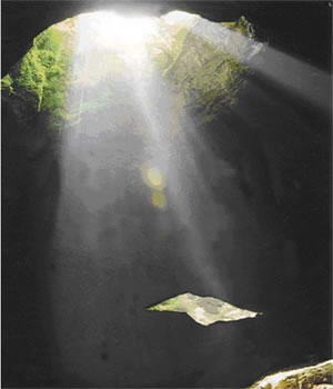 川洞庵“世界第一大天坑”,位于曾家镇南3km,在海拔1400m的石灰岩溶洞群区内,公路可达,山上旧有“川主庙”,故得名。主洞高50m,分三层,第一层是石灰岩塌陷而成的天窗,面积约100㎡,第二层为平台,约3000㎡,第三层为平台中央塌陷形成的椭圆形池子,面积40㎡,深约10m。天窗上流水潺潺滴下,散为水雾,阳光照射,彩虹缤纷,玉珠落盘。第三层池子,终年潮湿,雨季积水2—3m,冷暖气流在坑内交融而成氤氲之气,洞内另有白莲教当年抗清而遗下的营垒遗迹、炮台遗迹。 |