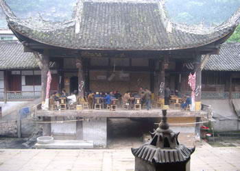 走过古镇的古街古庙,在十弯九曲的青瓦木房间走入古镇人的悠闲。历经沧桑的罗泉人勤劳朴实、憨厚大方。女人们喜欢在亲密的聊天中忙碌自己手中的针线活,老人们一边喝茶一边听戏,温暖的阳光照在他们满足的脸上。仅五里长的老街上茶馆就有十多家,生意颇为兴隆。走进桥边一家带有天井的茶馆,叫来一杯碗盖茶,听老人们讲述古镇辉煌的昨天。以产盐而闻名天下的罗泉,其悠久的历史可追溯到秦代,至清朝时盐业开发已达到顶峰,清光绪年间,罗泉已有盐井1500余眼,所产的井盐于1925年获巴黎世界博览会金奖。那时的罗泉商贾聚集,马嘶骡叫,热闹非,对岸的盐神庙是最好见证。盐神庙建于清同治七年(公元1868年),盐神庙是古镇的曾经辉煌的重要标志。庙内供管仲为盐神,关羽和火神则作为管仲的辅佐相伴左右,整个盐神庙重檐三级,翼角高翘,正殿屋顶的群龙嬉戏抢宝图,虽经百年风吹雨打仍栩栩如生。