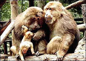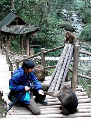 其实,早在一千多年前,峨眉山的猴子就与人结下了亲密的关系。山中早有“青猿洗钵”“白猿献果”等富有情趣的美丽传说,相传峨眉山高僧茂真和尚和药仙孙思邈经常在一起下棋,全靠一只青猴传书捎信,约定下棋时间,这就是“青猿洗钵”的故事。而所谓“白猿献果”则讲述不知何年何月,两位香客朝山,行至木皮岭这个地方时,苦于无水解渴。这时一只毛色雪白的猴子将三枚大蟠桃放在了路帝,二人吃了蟠桃之后,顿觉身轻,飞升而去。 峨眉山的猴子因为是沾仙山之灵气,与人相近,与人相通,所以被称为“灵猴”,假如没有峨眉灵猴,峨眉山的山水似乎就缺乏一点灵气,峨眉山的宗教文化似乎就缺少一点神气,有了峨眉灵猴,峨眉山就与其他名山更为不同了。 |