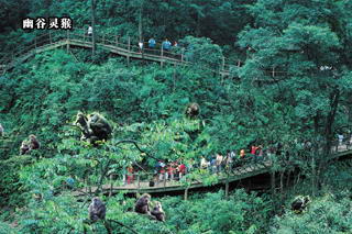 峨眉山灵猴,长期以来受到峨眉山宗教文化的感染,并且穿梭于这美丽的大自然,吸天地之灵气,汲日月之精华,成为山中活泼可爱的小精灵,因而,峨眉山灵猴就是峨眉山浓郁文化内涵和秀美自然风光的生动体现! 峨眉山野生自然生态猴区,是我国目前最大的野生自然生态猴区,其范围分布在海拨800米到2400米的群山峻岭中,据调查统计,相对集中的一共有6个群落,数量约有1000余只,其中数峨眉山中山区的灵猴最具灵性。在这一区内,有流泉飞瀑、茂林修竹。花草繁茂、气候温和。是猴群理想的栖息地,游人们置身于此,便能真切感受到“西游记”神话世界中花果山,水帘洞的人间仙境,尽情领略美猴王的子孙们在野生猴区的生态之美。