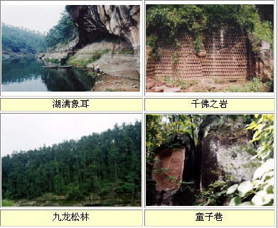 象耳风光迷人。寺周有象鼻山、象耳山、檫耳岩环抱,松柏茂密,斑竹万竿,青翠欲滴。寺前太白湖,主叉道总计长达10华里以上,曲折回环,山水一色,荡舟其间,静得出奇。