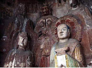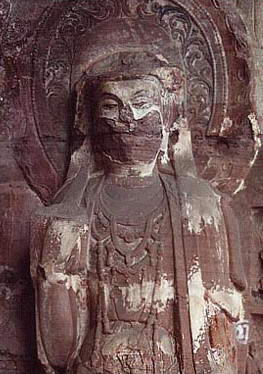龛室分布在长约49米,高约15米的红 砂岩壁上,6号龛居中,以西分布密集,占总龛数的百分之九十以上共63龛(包括大龛中的小龛).除最大 的第6龛面积近20平方米外,其余多在1平方米以下。全部造像共600余身,最大的高3米以上,小的在0.3米以下,其中有400余身造在面积不到7平方米的第58龛内。第6龛为主龛;居于诸龛的中心位置,规 模最大,龛长4.6米,宽4.1米,龛顶部为刻刻重檐边,刻连续卷草纹饰。主体造像为一佛、二菩萨、二弟子、八部众、二供养入,共15身。释迦牟尼结跏趺坐于建台上,头顶螺譬,两耳垂大,双手合十于前(残断续接),圆形火焰背光.佛的肩宽1.3米,像高2.35米;二菩萨侍立于释迦两侧.主龛两外侧各有一力士,肩宽1米,高3.2米,上身裸露,下著短裤,肌肉隆突,雄健膘悍,怒目圆睁,威风凛凛,主龛内 共有小龛24个,造像67身,两侧龛柱正面各有5小龛,左5龛造像9身,右5龛造像7身,遗像中除力士保 存较好外,其余皆遭不同程度的破坏。