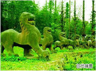 下面就将芦山九具汉代石兽主要有关情况分别作出介绍:一、巴郡太守樊敏墓前及樊碑近侧石兽 1、樊敏墓前神兽二具(镌刻于公元205年),均高1.45米,长2米,宽0.63米。一具为雄性,前爪抚蟾蜍;一具为雌性,前爪抚蟹。二具神兽首似虎,有双翼,做挺胸昂首迈步向前的雄姿,风格浑厚质朴,具有娇健威猛之气势。二具神兽造型取材于《山海经》。其前爪所抚之蟾蜍、蟹源出“嫦娥化蟾蜍”、“女丑有大蟹”。 2、樊敏碑原近侧石狮一具,通高1.08米,长1.77米,宽0.6米,造型与后述之杨君墓前石狮略同。体型较小,腿有卷毛,形态生动,但腿脚尚未镂刻完毕,即已废弃,可能为建安八年(公元203年)制作时与樊敏职官不相称而废弃。 3、樊敏碑原近侧石兽胚一具,躯体轮廓已打制出雏形,可能为制作与上述废弃之石狮配对之石胚料。底座线已刻出,腹部已开凿,首背轮廓分明,为研究汉代石刻工艺流程之重要实物。石胚高1.28米,长2.05米,宽0.47米。 二、杨君(即杨统,蜀郡属国都尉府都尉)墓前石狮一对 石狮均高1.7米,长2.3米,宽0.66米。造型方中有圆,四肢粗壮凝重,体态雄健浑厚,作昂首张口、挺胸翘尾状,气宇轩昂,静中有动,柔中带刚,饱含着充沛的生命力。 三、石羊村石兽二具 1、独角兽一具,通高1.58米,长1.96米,宽0.57米,左前腿已残,首略偏左,下颌有束胡,膊有双翅,腿有卷毛,昂首挺胸,造型较特异,一般名“獬”,相传能辨邪恶。 2、卷角羊首神兽一具,通高1.7米,长2米,宽0.52米,首颈前肢至胸已被截为三段,幸尚全存。头部为双卷角,兽爪,膊有翅,健羽三出及腹,首后仰,挺胸扬爪,造型特异,一般称为“天禄”。“天禄”之名可能是借《尚书. 大禹谟》“天禄永终”之意而来,以求福禄名藉。 四、石箱村石狮一具 石狮已残。原为两具,一具清末时因河岸坍塌,即已坠入青衣江中,其造型与杨君墓前石狮近似。残高1.1米,残长1.5米。附注:上述九具石兽,除樊敏墓前及樊敏碑近侧四具(包括一具石兽胚)为原址陈列,其它五具为上述介绍地方于1986年移至东汉石刻馆。 |