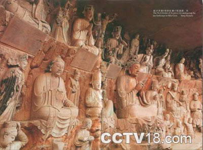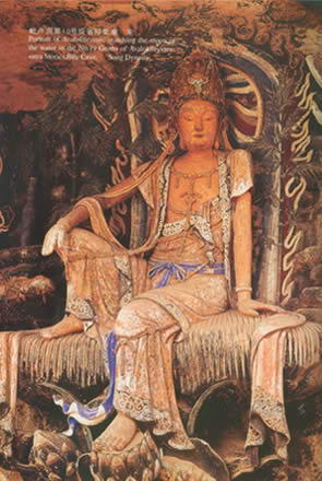 毗卢洞第19号观音经变窟 宋 据明代万历年间碑文追述,毗卢洞的石刻造像开创于五代后蜀,之后历代都进行过培修、补刻。这里曾经是五代至北宋年间四川佛教密宗的主要道场之一。尤其是观音堂内雕刻的那尊“水月观音”,群众称她“紫竹观音”,英籍华人作家韩素英把她誉为“东方的维纳斯”,是全国少有的北宋石刻艺术珍品。这尊紫竹观音高3米,悬坐于那凸露的峭岩石窟之中。她背倚浮雕的紫竹和柳枝净瓶,头戴富丽华贵的贴金花冠;蛾眉上竖,凤眼下垂,直鼻微隆,朱唇略闭;上身穿短袖薄裟,袒胸裸肘,臂戴膀圈,璎珞象随身而泻的金色瀑布,网坠于胸腹;下身长裙薄如蝉翼,紧贴于腰腿之间,衣裙飘逸,富于动感。她坐在一张3米长的弧形荷叶上,上身稍左侧;左手抚撑叶面,右手放在膝盖,五指自然下垂;一双秀丽的赤脚,左脚悬于莲台,轻轻踏着花蕊,右腿弯曲上翘,脚踏莲叶,故人们又俗称她“翘脚观音”。紫竹观音仿佛就是一位丰姿绰约、温柔潇洒的妙龄女郎。她既具少女的妩媚,又具女神的仪容,世俗风味极浓,人们又爱称她为“风流观音”。看了紫竹观音,令人不得不为宋代雕刻大师们那出神入化、巧夺天工的精堪技艺所折服。