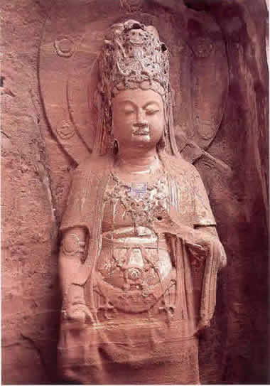 千佛寨第56号窟左壁菩萨像之一 千佛寨的石刻造像,规模恢宏壮观,共有造像105龛,大小佛像3061尊,分布在南北两岩,整个造像区竟长达705米。据《安岳县志》记载,千佛寨摩崖造像始于隋开皇十三年(公元593年),从石刻题记看,有“开元”、“天宝”,最晚题记为南宋庆元元年(1195年),历时600余载。现在的主要造像多为盛唐时期作品,也尚存有少量的明清时代作品。南北两岩除佛像外,还有摩崖浮图7座,唐碑3块,历代题记26处。浮图最高的达4.6米,最小的0.8米;最大的龛窟宽6.4米,高6米,深3.3米。摩崖造像高3-6米的有14尊,1-2米的有250尊,其中最大的释迦牟尼佛高达6.2米。南岩多为唐代造像,其面部丰盈,高鼻垂耳,袒胸露肌,衣纹疏深,线条流畅,简洁明快,古朴典雅。尤以56号龛的净瓶观音更具典型的盛唐石刻风韵。另外,盛唐密宗 造像药师琉璃佛也属少见的石刻艺术珍品。北岩有一龛保存完好的《药师经变相》,药师佛系唐代密宗造像题材。药师佛端坐于束腰圆莲宝座,头部上端刻有华盖,身侧有菩提树,左右分刻八大菩萨和九横死,十二大愿,还雕刻有病死、受王法死和被虎、豹、蛇咬死等场面,是其它石刻造像中罕见的珍品。千佛寨还刻有众多的菩萨、罗汉、金刚、力士、护法神、飞天、供养人以及各种“经变”故事造像,充分表现出天上、人间、地狱的苦乐悲欢,内容十分丰富,雕刻技艺精美。