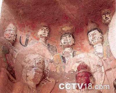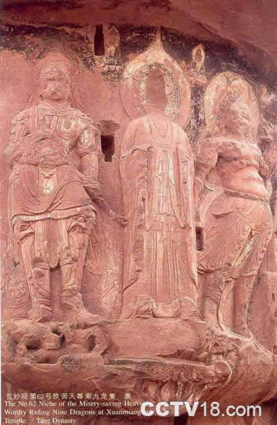 玄妙观第11号老君龛正壁右上方护法像 造像题材以道教为主,兼刻有佛、道合龛造像,也有少数佛教造像,保存完好。主要造像有老君、释迦和老君并坐、真人、十二时神、金刚力士、九头鸟、观音、势至等。其造像错落有致,优美生动。其中最大的一龛是老君造像龛,始凿于唐开元18年。龛窟呈双叠室型,方口,高.3.6米,宽3.4米,深1米。龛内正壁雕凿主像老君,它趺坐于三层仰莲瓣莲台上,其下是一层覆莲瓣的莲台,再下是八棱座基。老君面部丰满圆润,两眼平视,头戴莲花冠,结胡须,身着高宽领道袍,胸前有一张三足凭几,左手放几上,右手执宝扇,头后有莲瓣形背光。其左右侍立金童、玉女,均头戴莲花冠,身着交领宽袖道袍。左像双手执笏,右像双手合十,赤足立于莲台之上。龛窟的左右壁上,各刻一女真人,其身躯高于金童、玉女。龛窟左右壁与正壁上部对称刻护法神,合为十二时神。老君脚下外沿刻有蹲狮和12尊小造像,其项均有背光。龛外刻一真人像,身着交领大衫,外罩半臂袍,手捧玉章,站立于莲台上。左边立一束发神将,深目阔嘴,身着甲胄,右手举剑,护腿至膝盖,脚穿长统靴。龛窟下部站立十二神将,穿戴近似十二时神。