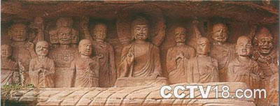 卧佛院第3号窟卧佛上方释迦牟尼临终说法像 卧佛院最具规模和价值的,当数南北岩壁上开凿的55个藏经洞内的大批石刻佛经。窟内镌刻着从唐开元11年(公元723年)至23年(738年),距今1260多年前的大量佛经。已刻经文15窟,刻字面积152平方米,共40余万字。字为阴刻,见方1至2厘米大小,方格直行镌刻在每一窟内的左中右三方窟壁上。从46号窟左壁释静泰撰写的“经论目序”中得知,“一切经论目序”来自“大唐东京(洛阳)大敬爱寺”。主要经目有《大唐东京大敬爱寺一切经论目序》、《佛名经》、《大般涅磐经》、《般若波罗密多心经》、《佛顶尊胜陀罗尼经》、《檀三藏经》、《妙法莲花经》等,是我国宝贵的石刻经库。刻经题记现存有“开元十五年”、“十七年”、“二十三年”等。其中,“开元十一年”、“开元二十一年卧佛院僧玄应书”等字迹尚比较清晰。据此可以肯定,卧佛及石刻佛经为盛唐时期的杰作。虽然卧佛寺院早已荡然无存,但从石刻造像及石刻佛经的规模,也可推测出当时卧佛院的辉煌和古普州经济文化的繁荣景象。 |