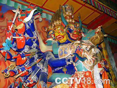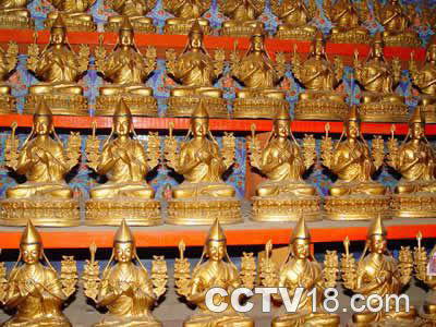 大殿里面供奉着佛祖释迦牟尼和黄教创始人宗喀巴的佛像,万余尊的泥塑小佛像,在殿内沿着墙壁陈列开去,使噶登彭德林寺的大殿成了名副其实的万佛殿。一幅幅描画着佛像的唐卡画在大殿的顶梁上高悬下来,接受着朝拜者的敬仰。幽暗中,闪烁的酥油灯虽然是星星点点,但却把巴塘人的心灵照耀得格外亮堂。此时的噶登彭德林寺是宁静的,静得让人能够听见酥油灯静悄悄燃烧的声音。从大殿出来上到二层一间小殿内,里面供奉着释迦牟尼的七岁等身像,巴塘人将这尊用檀香木雕成的佛像叫作“松觉扎玛”。寺庙特地在佛像的旁边置放了一架小梯,供信徒上前嗅闻它的檀香气息,接受佛光的洗浴。关于这尊“松觉扎玛”,巴塘的民间传说最初是由噶举派创始人玛尔巴从印度带来,送给当年的木氏土司,后来安放在虎头山上的丹戈寺里,在寺庙频繁的迁移中,“松觉扎玛”曾经神秘地消失。后来一个巴塘农妇到丹戈寺的遗址上去挖红泥修建房屋,从土里传出“哎哟”的呻吟声,后来又听到了“向左挖”、“向右挖”的恳求声。农妇此时朝四周看了又看,山上并没有旁人,于是她急忙下山向人们告知了这件事。于是,噶登彭德林寺和当时的土司一起派人前去挖掘,就挖出了这尊“松觉扎玛”。但此后土司和噶登彭德林寺又为佛像的归属发生了争执,最终双方达成协议,既然“松觉扎玛”能开口讲话,那就由它自己来选择何去何从。他们将佛像临时供奉在一顶帐篷里,双方都派人监护,并言定第二天佛像要是面向土司的官寨,佛像就归土司所有,如佛像面向噶登彭德林寺,此后就由噶登彭德林寺供奉。经过寺庙喇嘛们一夜的颂经祈祷,第二天,这尊“松觉扎玛”果真面向的是噶登彭德林寺的方向,于是,佛像就被迎送到了噶登彭德林寺的大殿内供奉。