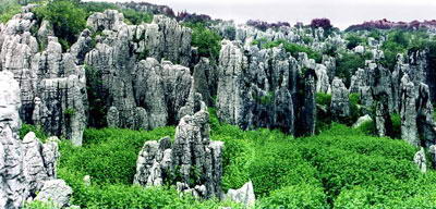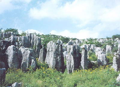 洛布石林与韭菜坪峰顶遥相对应,被万亩草场环绕着的千亩石林,面积不低于6平方公里,林内奇石密布,造型各异,风姿迥然,以未曾粉饰过的沌洁的满身灵气,或立或卧或行,或玲珑剔透,或魁伟遒劲,或如万马奔腾,百万雄兵布阵。本地人称之为洛布石林,彝族语即“落布惹”,大意是滑竹与石头构成的森林,也可以说成是像古代民族一样的石林。