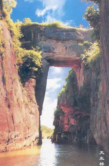 桥下60余米宽的河水终年不息地流淌,波光数郝,清澈见底,鱼JL漫游。桥上林木丛生,郁郁葱葱。林间崖畔,10多种珍禽栖息,—飞歌欢舞,与人同乐。 |