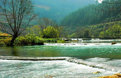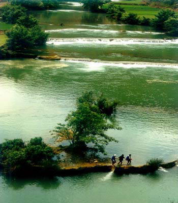 多依胜景 板台之上,河道宽直,视野开阔。风情浓郁的布依村寨位于河边;村旁古木参天,修竹茂密,芭蕉成行,河边清泉四溢,幽兰生长;沿河缓缓而行,幽兰生谷香生径,方竹满山绿满溪。河中远山倒影扑朔迷离,近处原始古朴的水车缓慢运转,两岸稻浪翻滚,金黄一片。面对这幽静迷人的田园风光,定会依依不舍,留恋忘返。