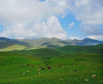 18万亩天然草山,生长有牛毛草,黑麦草,红三叶,白三叶等20余种高山牧草。春夏季节,牧草丛生,各色山花竞相开放。风吹草低,羊群突现,银色溪流,相间其间,景色绚丽,层次深远。秋季时节,草色发黄、七色地毯般美丽,更是令人心旷神怡。冬季,寒潮袭来,草山四野漫天雪花飞舞,银装素裹,万物冰雕玉砌,俨然北国风光,唯余莽莽。