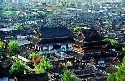 古城周围不筑城墙,据说是因为木土司居于城中,一筑城就等于“木”字加个框成了一个“困”字,无异于把“木”困住。木氏土司背枕狮子山,山上遍植柏树,如今狮子山上还保存有一大片古老的柏树林,它就是“丽江十二景”之一的“黄山古柏”。除了这一片古柏林,当地民众在20世纪50-60年代义务栽种的大批柏树也日益茂盛,形成了郁郁葱葱的树林。 在狮子山极目下望,古城栉次鳞比的民居瓦房呈现出一片与天地混融的黛青色,苍苍茫茫宛若一幅巨大的水墨画。 木土司的府第虽有王者气度,却一反中原王城“居中为尊”的传统,将府第建于城南一隅。而作为全城中心的则是商贾云集的四方街,纵横交错的街道从四方街这一商贸中心向四面八方辐射。 从中可看出古城最初形成于乡村集市,最终也因商业贸易而繁荣。这与古城千百年来作为“茶马古道”重镇的历史密切相关。木土司的宫廷式建筑在明代已蔚为壮观,明代旅行家、地理学家徐霞客在他的《滇游日记》中就曾惊叹“宫室之丽,拟于王者”。明代古城居民已达千余户,民居建筑颇具规模,徐霞客曾描述当时丽江古城“民房群落,瓦屋栉比”,可见民居繁盛之景象。 |