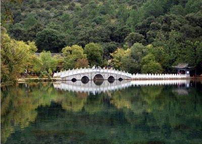 玉泉公园位于丽江古城北面象山脚下,始建于乾隆二年(1737),其后乾隆六十年、光绪十八年均有重修记载。旧名玉泉龙王庙,因获清嘉庆、光绪两朝皇帝敕封“龙神”而得名,后改称黑龙潭。又名玉泉公园。泉水从山麓岩石间涌出,汇集成广约四万平方米深潭,水碧如玉,因称玉泉。四周山青水秀,柳暗花明。依山傍水造型优美的古建筑点缀其间。其流光溢彩,常引人驻足留连。潭水清澈见底,远处高耸的玉龙雪山倒映其中,美不胜收。