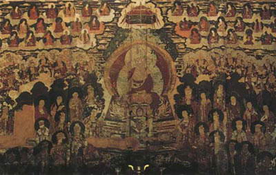 白沙古镇的中心地带是被称为“木都”的殿宇群落和象征政治权力的大广场,有解脱林内的福国寺(山门和大殿已搬至玉泉公园内)、大宝积宫、琉璃殿、大定阁等宗教建筑群。而帮助木氏积累财富的商贸广场大大小于“木都广场”的规模,这表明,木氏家族在这时还是将商业作为权利的附属品,但在规划大研古城时心胸就更宽广了。此外,木氏在这里就开始从玉龙雪山引来泉水绕商业广场东侧而过,后来在大研更将流水的妙处发挥到淋漓尽致。 白沙壁画 白沙是丽江壁画的主要聚集点,明洪武十五年,纳西族首领阿甲阿得率众归附明朝,得明太祖“钦赐姓木”,木氏土司秉“纳百川精神”、“窥中原之脉”的思想,积极引进内地先进文化和技艺,在白沙大肆修建庙宇二十余处,并邀请汉、藏、纳西族画师在这些殿宇四壁作画,而大宝积宫和琉璃殿及大定阁是保存明代壁画较集中之处。