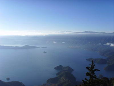 到山顶最高处有一块近百亩的平缓地,周围是一片高约10米左右的杜鹃林,边沿上凸现出来的奇峰异石在岁月的浸蚀作用下,形成了形态各异的石笋,任凭你翱翔想像的翅膀去寻觅感觉。这里是转山节时人们烧香拜神最高的地方。在此俯瞰永宁坝和泸沽湖更是另有一番感觉,永宁坝古朴安宁的村庄星星点点镶嵌在坝子边沿的山脚下。泸沽湖千姿的海湾一个接一个,婉蜒的山脊狂龙般的一条条从远处直伸湖中。点缀在湖中的五个岛屿恰似一颗颗绿宝石,在波粼粼的湖水映衬下闪闪发光,远远望去好似一场群龙夺珠的场面呈现在眼前。更为神奇的是,站在格姆山顶,方圆几百里的胜景一览无遗,东可看日出,随着每天红日的升起,新的希望也从这里升起;西可看日落,让您感受夕阳无限好的景致;西南可看到秀美的玉龙雪山;西北可看到巍峨的木里贡嘎林雪山,让你亲身体验一览众山小的传人情怀。一个个炊烟缭绕的村庄,一条条活泼翻滚的巨龙,一颗颗闪闪发光的宝石和一声声此起彼伏的狗吠鸡鸣声,激发出多少灵感妙想。当你漫步在石笋林立之中一次次被云雾洗礼沐浴时,就仿佛是在天堂云游般惬意。