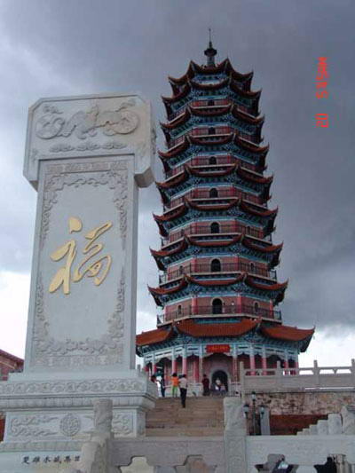楚雄福塔立于云南省楚雄彝族自治州首府楚雄市鹿城东山之巅。由楚雄州政协倡议社会捐资,在明代古塔遗址上重建。2003年3月开工,2004年10月告竣。塔为八角九层楼阁外廊式建筑,高59米。是中国第一座以彩画木雕石刻铜铸艺术展示中华福文化深厚内涵的景观古塔。