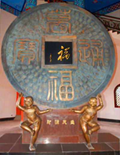 一层大厅置放一枚由两个青铜送财童子扶托,直径3.66米,重3.6吨中国最大的铜铸古钱币“万福通宝”,墙面镶有墨玉大理石雕刻鎏金孙中山、毛泽东、周恩来、刘少奇、朱德、邓小平手书福字。二至八层各立一尊不同形态铜铸乐施弥勒,九层悬挂高1.48米,重1.2吨百福铜钟。每层的斗拱、梁柱、藻井彩绘各种福吉祥图案。一层有四道刻有双园福字的铜门,二至九层均有椴木雕刻福字及图案的门窗。塔外有三层青石浮雕凭栏,凭栏是108块福雕图案。塔内塔外,各体福字和各种福图案不胜枚数。塔内每层高挂数盏木雕福字宫灯。塔外飞阁安装现代灯光,夜幕降临,流光溢彩,夺目苍穹。