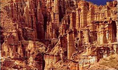尖笋型:这种类型的土林,其组成物质主要是沙和粘土,胶结较松散,顶部也没有胶结坚硬的遮挡层。因此,受雨水的冲刷淋蚀和地表水流的侵蚀切割,形成圆锥状的土柱,这种土林顶部尖锐,形态像硕大的雨后春笋,又像宝塔的尖顶,其高度一般为5-10米。
