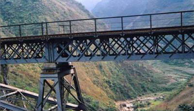 滇越铁路五家寨人字桥位于屏边县北湾圹乡度箐与倮姑站之间,是滇越铁路上(昆明至越南河内)的巨型钢架桥,全用钢板、槽、角钢、铆钉联接而成。人字桥在两山峭壁之间的跨度为67米,距谷底100米。它以独特的设计、精巧的造型而名传天下。人字桥是由法国女工程师鲍尔-波丁设计,于1907年3月10日动工,1908年12月6日竣工。1998年公布为云南省文物保护单位。