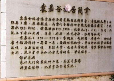 云南省唯一经济特科状元嘉谷先生的故居,为一幢明清风格的民居,目前是云南省重点文物保护单位。袁嘉谷故居曾一度被其它单位占用,1994年,县政府决定搬迁出单位,并于当年11月修复,作为袁嘉谷故居纪念馆,陈列袁氏事迹及石屏文物展览,供游人参观游览,亦作为爱国主义教育基地。