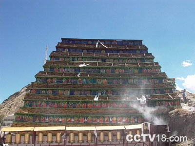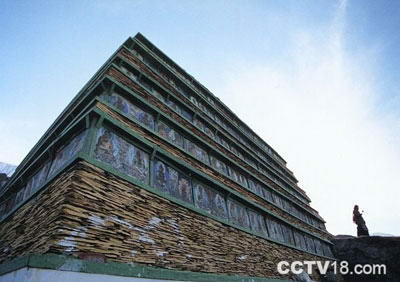 窟内有造像七十多尊,除多尊为泥塑外,余皆为石刻像,零散地分布在中心立柱四面和洞窟的南面、西面、北面的岩壁上。造像以宗教人物为藏王、历史人物为主,从造像技法、形象特征上看为不同时期雕成。在诸造像中尤以经廊南壁上排的尼玛次造像最为有趣。造像高仅29厘米,饰高发髻、戴耳坠、项链、手镯、上身袒露、披帛、下身着紧腿裤,右手持钵,左手指着上方雕刻的一个金光四射的太阳,打座在方台上。“尼玛”是藏语太阳之意,“次”是抓的意思。传说尼玛是古天竺的一位神人,他曾抓下天上无数个太阳。这个传 说带点宗教色彩,但却与我国古代“后翌射日”的神话有某种相似。除此之外,窟内藏王松赞干布和九位大臣的造像也雕刻得栩栩如生、颇为传神。那头戴塔式夹帽、顶端露出一小佛头(这是松赞干布像的主要特征),浓眉大眼,二排八字胡须,表情庄重的松赞干布像,虽不知刻于何年何月出自哪一位艺匠之手,但这位在藏族历史上做出过辉煌业绩的杰出人物,为世代藏族人民敬仰,奉为神的化身而千古留名,紧靠着松赞干布像右侧雕刻的是文成公主像,当朝圣者立足于她面前默默祈诵时,她那为藏汉两个民族长期合睦友好开创的历史业绩和所做出的伟大贡献,世代传颂。离开这传说颇多、使人产生不少联想的石窟,去领略与查拉路甫石窟相映生辉的凿刻于“角布日”神山东山头北崖壁、山北的南崖、山南面崖壁上的万尊摩崖造像与六字真经,那您可谓走进了佛国境界、艺术的大宫殿里。 每到一个重要的宗教节日,药王山的转经路上,人潮涌动,焚香祈祷,叩头膜拜把信徒们的内心祈盼倾至这佛光四溢的神山上。不少康区、藏北、境外的信教徒不远万里,从家乡携带着刻有六字真言的牛头,石块来到神山面前,恭敬置于山崖上下班,以表达自己的真诚。平日里,朝圣的信徒手摇转经筒,口诵六字真言心度虔诚地绕着药王山朝拜,山崖下的流浪艺匠仍在潜心地凿刻着奉献给神、给人的“艺术品”。 |