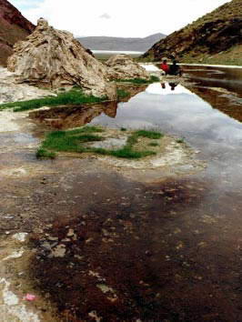 绒玛温泉某处泉眼终年热气不断 绒玛温泉目前还处于纯天然状态,除了那个两个石塔和经幡外,没有任何人工痕迹。听当地人说,除了冬天老百姓偶尔来这里洗洗衣服外,几乎没有人光顾。 交通:绒玛岩画和温泉位于尼玛县绒玛乡清水河谷,距绒玛乡约10公里。 |