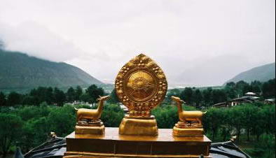 喇嘛岭寺的法轮 整处寺院呈正四角形,外底层屋檐检有二十角,第二到第三层屋檐为八角,佛殿高20多米,内径10余米,上覆金顶,呈塔形,四面墙体分以白蓝红绿四色涂之,犹如镶嵌在青山绿水中的一颗宝石。 |