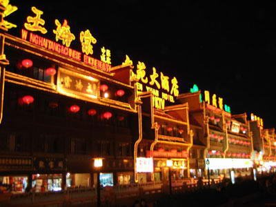 东大街街边的建筑参差不齐,有年久失修的两三层楼房,也有像凯悦饭店那样很豪华很大气的建筑。由于近几年来这条街上地价不断上涨,所以很多地方开始急不可耐的拆、盖、装修,一栋栋的建筑用红蓝相间的防雨布遮住了脸孔,很害羞的样子。在一些还没来得及装修的旧房子前,第一层门面房子也已经被装饰得很好。虽然一层的崭新和二层的破旧对比起来很滑稽,但是这丝毫不影响他们的生意兴隆。在东大街上,最多的店铺是卖衣服的专卖店,而且大部分是诸如Baleno、JeansWest之类价格不算太高的大众牌子,在打折的时候,生意非常好。最近又出现了几家韩国的服装店,生意也很火。但是这里的潮流总是慢了一拍——在沿海地区已经满街都是“日韩流”的时候,这里还很希罕。东大街上有很多卖小吃的,油炸里脊和钟楼小奶糕是最受欢迎的。油炸里脊1块钱一支,小奶糕5毛。很多人就站在街边,吃的满嘴流油,然后把吃剩下的竹签子扔在身旁的垃圾箱里,心满意足地抹抹嘴。再就是卖包子的,钟楼附近的五一大包很受欢迎,也很便宜。很奇怪的一点是,在这条寸土寸金的街上,居然还有一些很廉价的小饭馆,卖着3块钱一碗的拉条子。
