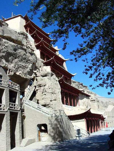 敦煌莫高窟历史 敦煌莫高窟位于中国甘肃省敦煌市东南25公里处的鸣沙山东麓断崖上,前临宕泉河,面向东,南北长1680米,高50米。洞窟分布高低错落、鳞次栉比,上、下最多有五层。它始建于十六国时期,据唐《李克让重修莫高窟佛龛碑》的记载,前秦建元二年(366年),僧人乐僔路经此山,忽见金光闪耀,如现万佛,于是便在岩壁上开凿了第一个洞窟。此后法良禅师等又继续在此建洞修禅,称为“漠高窟”,意为“沙漠的高处”。后世因“漠”与“莫”通用,便改称为“莫高窟”。北魏、西魏和北周时,统治者崇信佛教,石窟建造得到王公贵族们的支持,发展较快。隋唐时期,随着丝绸之路的繁荣,莫高窟更是兴盛,在武则天时有洞窟千余个。安史之乱后,敦煌先后由吐蕃和归义军占领,但造像活动未受太大影响。北宋、西夏和元代,莫高窟渐趋衰落,仅以重修前朝窟室为主,新建极少。元朝以后,随着丝绸之路的废弃,莫高窟也停止了兴建并逐渐湮没于世人的视野中。直到清康熙四十年(1701年)后,这里才重新为人注意。近代,人们通常称其为“千佛洞”。