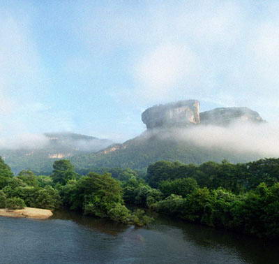 武山水帘洞景色 武山水帘洞在形似斧劈的试斧山东侧之峭壁上,武山水帘洞是一个约50米长,30米高,20米深的拱形自然洞穴。每当雨季,洞顶、洞壁泉水、雨水一齐涌出,洞檐流水如注,恰似珠帘掩门,故得名水帘洞。武山水帘洞内有四圣宫、观音寺、南殿、菩萨殿等多座建筑,各殿、台、亭、阁依自然岩洞有开有合,错落有致,工艺精巧。其中尤以菩萨殿最为高大华丽。该殿上下两层,下层石壁洞中有一汪清池,清澈见底;上层横匾大书“西山暮雨”四字,内塑当地民间传说中的麻线娘娘;水帘洞的崖面上保存着北魏、隋、唐、元各代的佛教巨幅壁画。整个洞内楼台、泉石、雕塑、画像相辉相映,大有天然布景之趣。