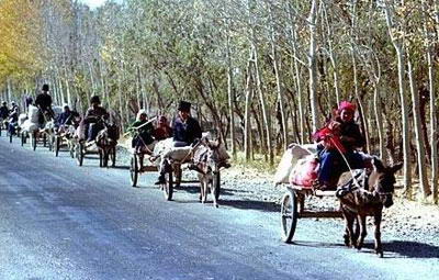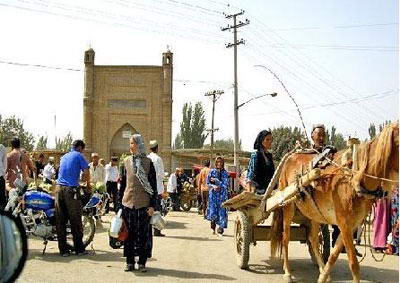 二千多年前,这个古渡是丝绸之路上的重要关隘。南来北往的商贾在这里停留,在古渡边等待渡河。这条河叫库车河,据说也叫子母河,就是西游记女儿国中的那条喝口水就怀孕的神奇的河。自古以来,每年冬春之交,巴扎在河滩形成,到了乾隆24年(公元1759年)就成为盛极一时的集市了,当时店铺栉比,行商坐贾,驼队马帮,热闹非凡。