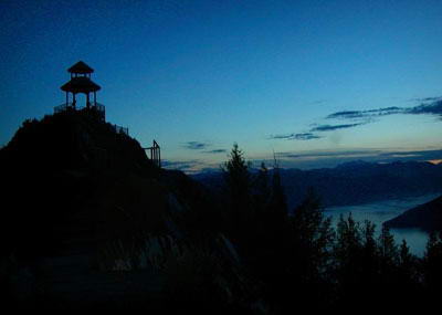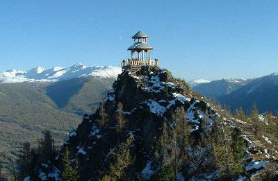 观鱼亭应该说是喀纳斯景点中的又一极品,它的价值并不在于亭子本身有多美,而在于它是惟一一个能驻足饱览喀纳斯美景的最佳平台。观鱼亭所处的海拔位置大约2030米,高出湖面660米。站在观鱼亭上,朝北远望,可以看到在阳光下熠熠闪光的友谊峰冰川,向南可以看到喀纳斯河象一条碧绿的彩带盘绕在崇山峻岭之中,再往西看遍地绿草如茵、繁花似锦,一派迷人的草原风光。