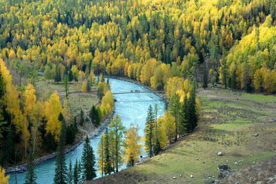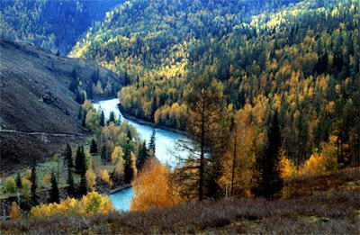 驼颈湾(海拔1250米)Tuojing Bend(Altitude1250m)这里是进入喀纳斯河河谷第一个景点,哈萨克语称之为“博托木衣”,意为骆驼脖子,喀纳斯河在这里形成了一个恰似驼颈的大拐弯。在距今数十万年前的第四纪冰期中,阿尔泰山的冰川曾向下扩展至此,因冰川刨蚀,使河谷断面呈宽阔的U形。冰川退缩后,地壳多次抬升,河流深切,形成峡谷,并在河床两岸至少形成四级阶地,它记录了地壳的阶段性上升。