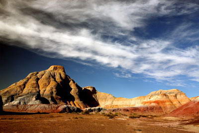 一般由倾角不大的侏罗纪地层构成的阿勒泰五彩城,岩画凹凸相间,岩石色泽多变,以红为主,间以绿、黄、白、黑及过渡色彩,酷似五彩古堡。阿勒泰五彩城与乌尔禾魔鬼城的雅丹地貌相比更具有良好的视觉效果。另还有更加丰富的旅游活动内容,如采捡玛瑙石,观赏荒漠野生动物等,是观光旅游、猎奇、科学考察、科普教育、摄影等的理想场所。 |