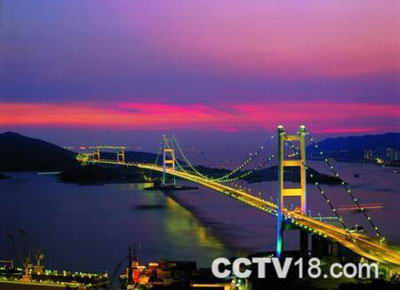 青马大桥是为了赤蜡角机场而建的十大核心工程之一,可算是世界级建筑,它横跨青衣岛及马湾,全长2,160公尺,主桥跨度也达1377米,两座吊塔,每座高206米,离海面62米,是全世界最长的行车、铁路两用吊桥。1992年,青马大桥开始建造,仅以五年时间完成,称得上是同类建筑中花最短时间。它与连接马湾、大屿山的汲水门大桥一起,像两道彩虹,成为香港新的观光景点。它的壮观恢宏的气势完全超越了美国的金门大桥。 欣赏雄伟的青马大桥的最佳观景点在肯衣岛西北端的“青屿干线访客中心”及一旁的观景台。在登上观景台的步道旁,耸立着最能象征大桥精神的两座纪念物-迥绕缆绳用高塔及主缆截取下来的断面。千万别小看这两座纪念物,当年为了架起支撑桥面的主缆,就靠这矗立于两岸的高塔,一圈又一圈地、像绕绳圈般地组成直径1.1公尺,长16,000公里的巨大缆绳,所使用的细缆长度,足足可以绕地球四周。看着一旁的说明,真的又对这座世界第一的吊桥升起更崇高的敬意,从此也对各地的吊桥,抱着敬佩的态度。