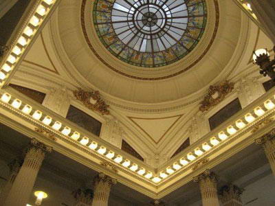 而国立台湾博物馆内则分为好几区,有动植物区,人文区,和台湾的原住民区,它们试着用这些不会说话的东西,诉说着台湾的历史。国立台湾博物馆除了这内容的软体之外,这整栋大楼也本身也就是一个很好的教材,身为三级古迹的它有着希腊神殿式的柱子,如回教堂般的屋顶,细致繁复的山墙,而山墙上的花纹全是欧式如家徽般的东西,一进入就是一个挑高的大厅,就像是路易时代的宫廷。 |