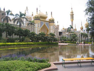 六福村主题游乐园建筑 六福村主题游乐园区内除建南太平洋原住民的建筑外,还有火山历险、侏罗纪乐园、大海盗、大怒神、八爪鱼、大海怪等惊险刺激的游乐设施。其中,大怒神让游客由17层楼高的半空中“自由落体”般瞬间落下,惊险万分。本六福村主题游乐园区也穿插各项动态表演。阿拉伯皇宫由37座伊斯兰式高塔组成,呈现金碧辉煌且神秘浪漫的气氛。游乐设施的设计以天方夜谭的冒险故事为背景,其中飞毯;风火轮、苏丹王冒险动感电影院、阿里巴巴与四十大盗的旋转木马最受欢迎。