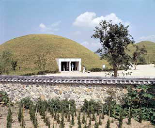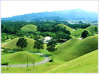远眺庆州市区,最引人注目的是高耸的巨大古坟。如果骑自行车或步行至这些巨大的古坟,便可以感受到现代和古代共存的神奇。这个大陵园面积12万坪,是新罗(BC57-AD935)的王和贵族的坟墓群。