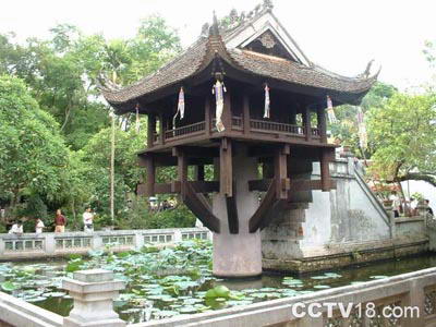 独柱寺位于巴亭广场西南,原寺建于1049年,1954年法国撤军时被炸毁,仅存石柱,1955年在原址依原样重建。独柱寺建在莲花池中,立于一根大柱上,造型奇特。
